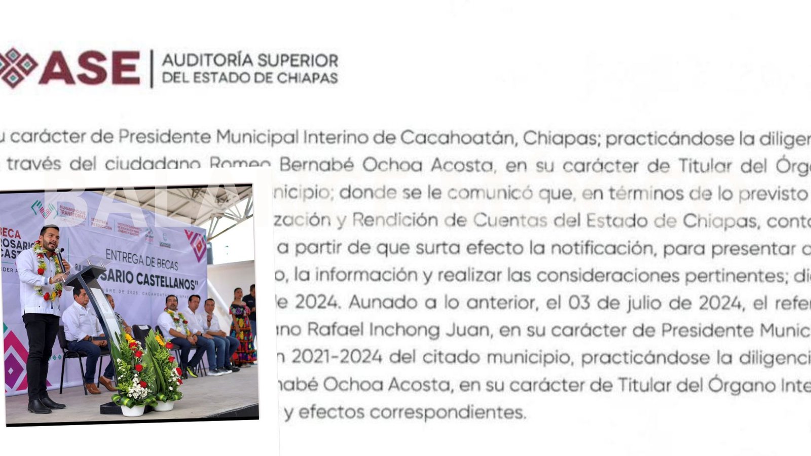 Cacahoatán, Chiapas (Balance México 09 octubre de 2025.– El presidente municipal Víctor Pérez Saldaña informó de manera oficial que el Ayuntamiento de Cacahoatán ha sido notificado por la Auditoría Superior del Estado (ASE) respecto a observaciones por un monto de 40 millones de pesos, correspondientes a ejercicios fiscales anteriores.