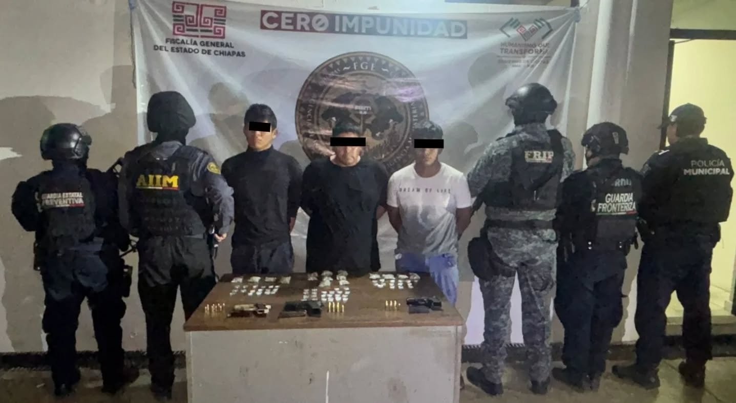 Huixtla,Chis. (Balance México 14 Marzo 2026).-La Secretaría de Seguridad del Pueblo (SSP), a través de la Fuerza de Reacción Inmediata Pakal, Guardia Estatal Fronteriza, Guardia Estatal Preventiva, en coordinación con la Agencia de Investigación Ministerial (AIIM) de la Fiscalía General del Estado(FGE), y la Policía Municipal, pusieron a disposición en flagrancia a tres masculinos por los delitos de violación a la Ley Federal de Armas de Fuego y Explosivos y contra la salud en el municipio de Huixtla.