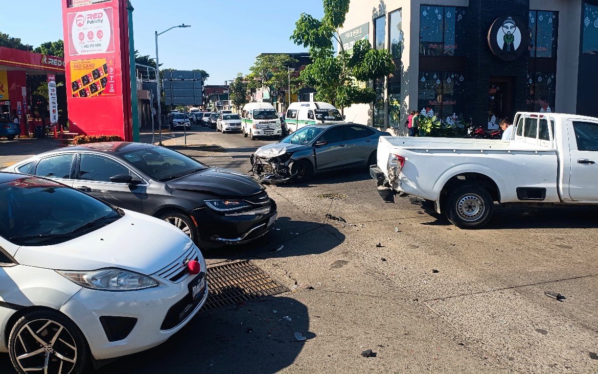 Un automóvil Chevrolet Onix presentó daños visibles en la parte frontal tras impactarse contra una camioneta Nissan NP-300. Esta última unidad terminó con golpes en ambos costados y en la parte trasera, luego de ser alcanzada por un Chrysler.
