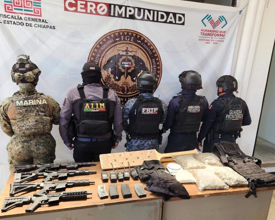 Huixtla, Chiapas (Balance México 10 Abril 2026).– Durante diligencias de cateo realizadas en tres inmuebles del municipio de Huixtla, autoridades aseguraron armas largas, droga, equipo táctico, vehículos y diversos objetos presuntamente vinculados a actividades ilícitas.
