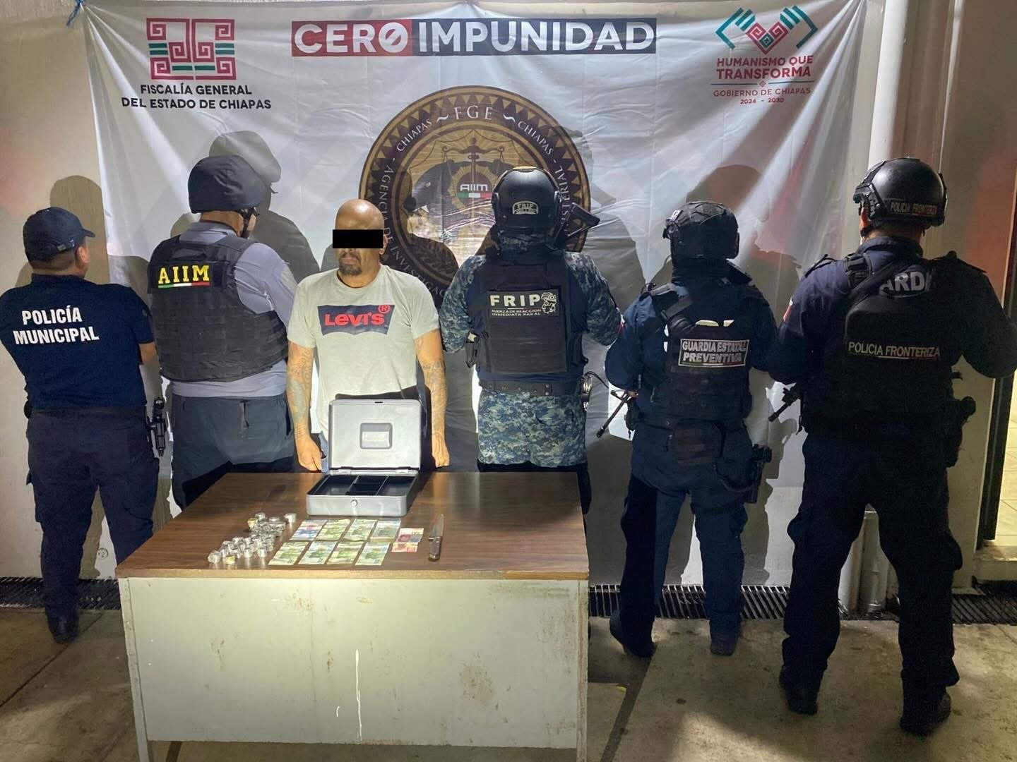 De acuerdo con información de la Secretaría de Seguridad del Pueblo, la detención se llevó a cabo durante patrullajes preventivos y de proximidad social, en coordinación con elementos de la Fuerza de Reacción Inmediata Pakal, Guardia Estatal Preventiva, Guardia Estatal Fronteriza, la Fiscalía General del Estado a través de la Agencia de Investigación e Inteligencia Ministerial, así como la Secretaría de Marina y la Policía Municipal.