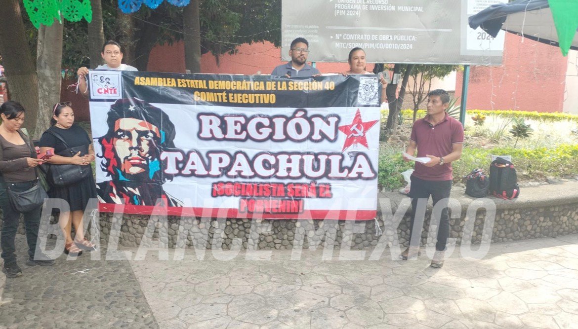 Tapachula, Chis. (Balance México 17 Diciembre 2025).-Este miércoles por la mañana, un grupo de maestros de la Asamblea Estatal Democrática de la sección 40 del SNTE-CNTE, comité ejecutivo regional Tapachula, se reunió en el parque Bicentenario para realizar un pronunciamiento para conmemorar el 46 aniversario de la Coordinadora Nacional de Trabajadores de la Educación (CNTE).