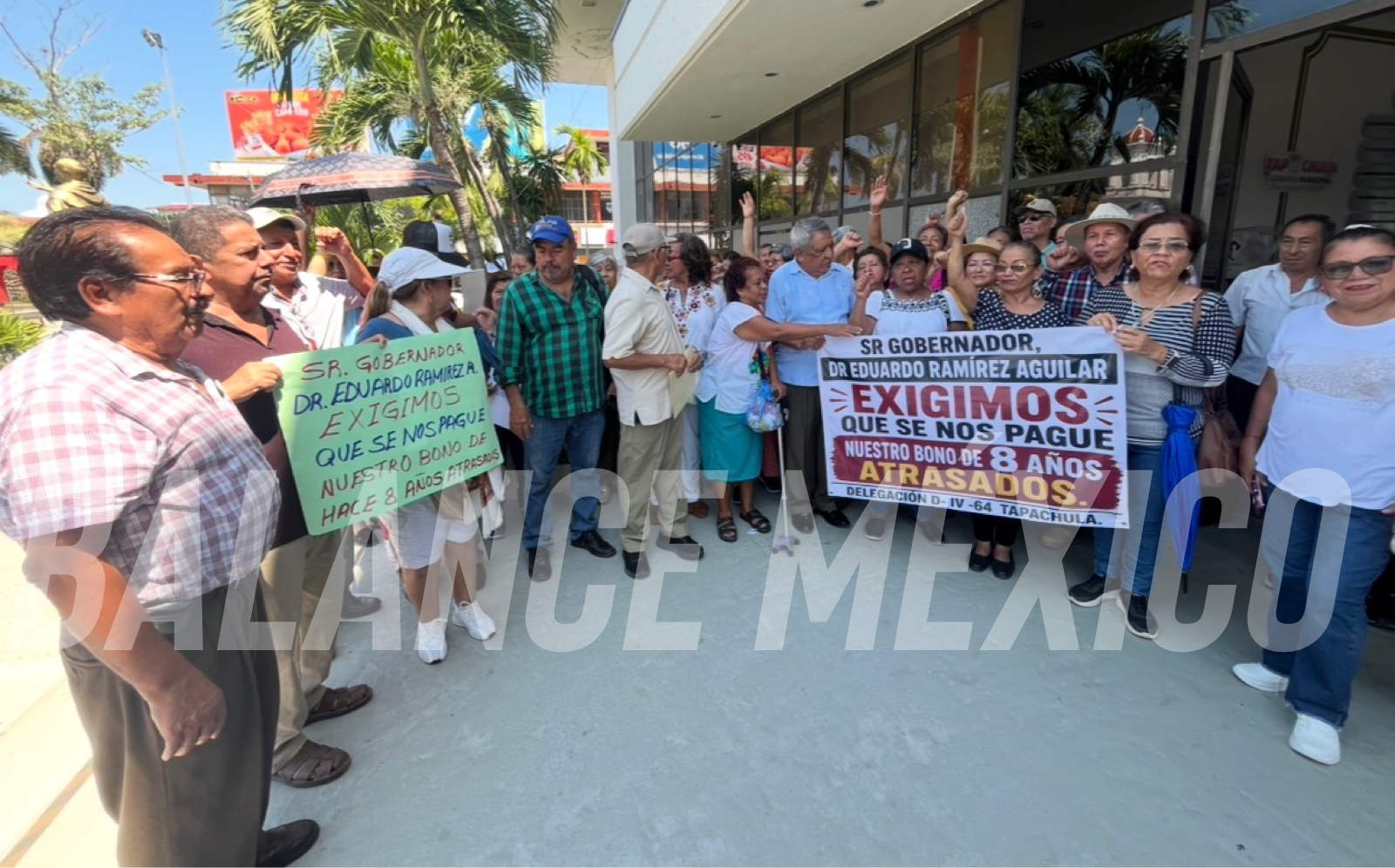 Tapachula, Chiapas (Balance México 27 Abril 2026).-.– Maestros jubilados de la Sección 7 salieron a manifestarse este lunes en Tapachula para exigir el pago de bonos que, aseguran, les adeudan desde hace más de ocho años. La protesta se concentró frente al Ayuntamiento, donde buscaron entregar un documento dirigido al presidente municipal, Yamil Melgar, para que intervenga ante el gobierno estatal.