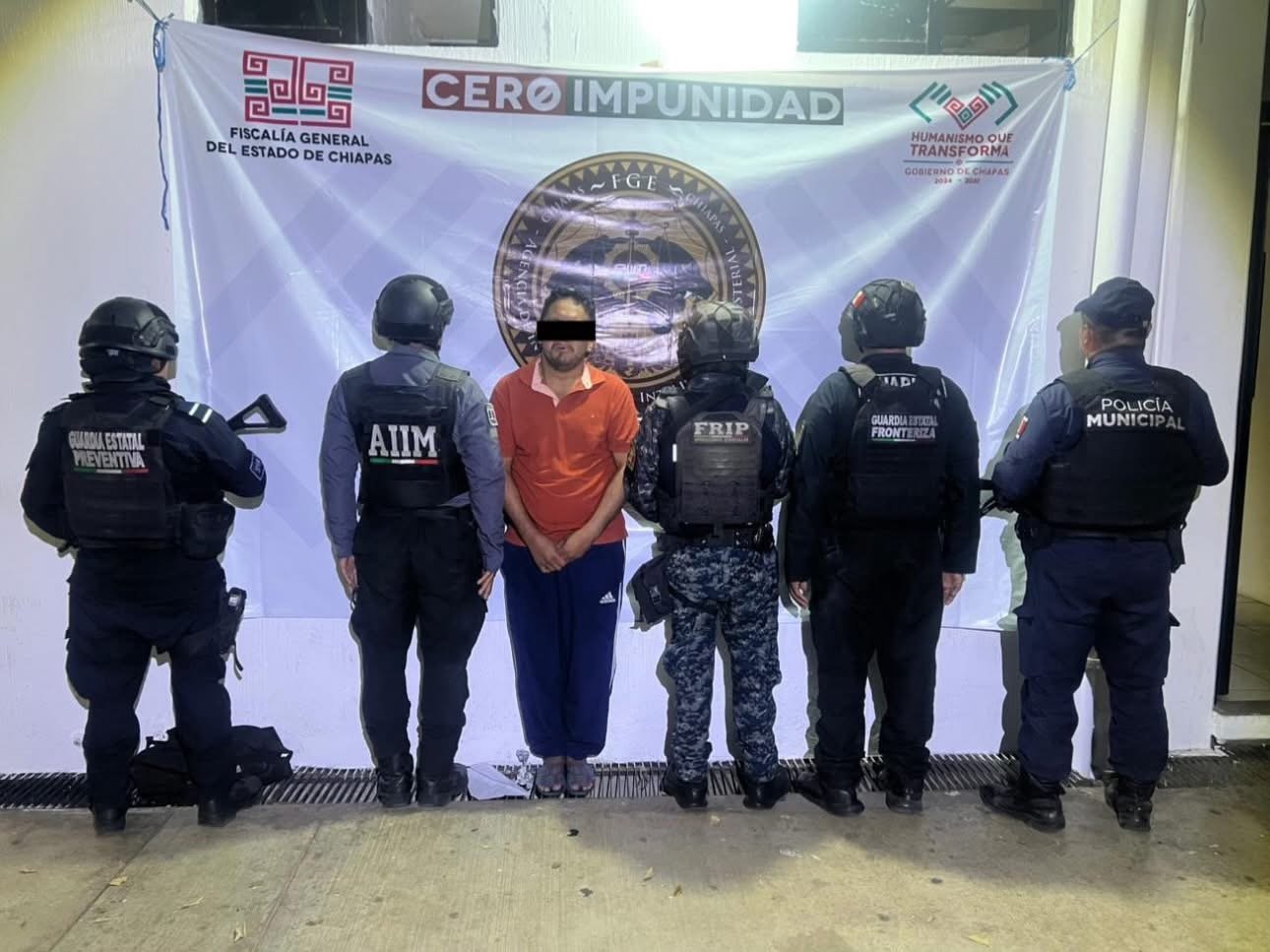 Tapachula, Chis. (Balance México 01 Marzo 2026).-La Secretaría de Seguridad del Pueblo (SSP) a través de la Guardia Estatal Fronteriza, Fuerza de Reacción Inmediata Pakal (FRIP), Guardia Estatal Preventiva (GEP) en coordinación con la Agencia de Investigación e Inteligencia Ministerial (AIIM), de la Fiscalía General del Estado (FGE) y la Policía Municipal, lograron el aseguramiento de una persona del sexo masculino por su probable responsabilidad en los delitos de daños dolosos, desobediencia y resistencia de particulares.