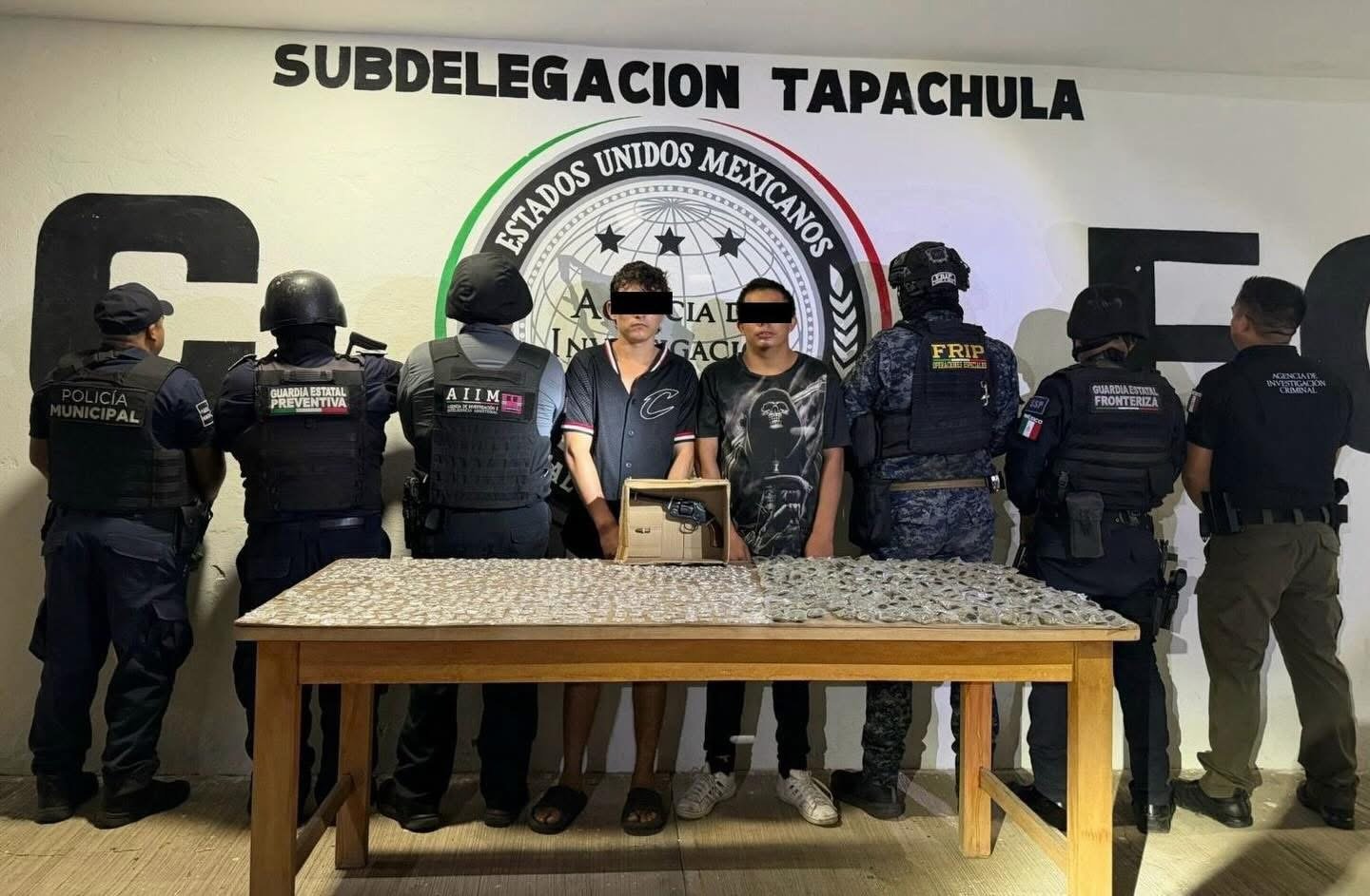 Tapachula, Chis. (Balance México 31 Marzo 2026).-Dos personas fueron detenidas en Tapachula por su presunta participación en delitos contra la salud y violación a la Ley Federal de Armas de Fuego y Explosivos, durante un operativo coordinado entre corporaciones de seguridad de los tres niveles de gobierno.