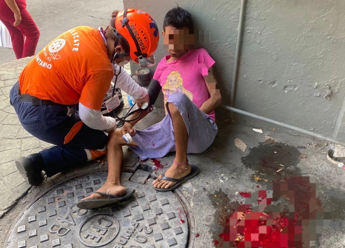 Paramédicos de la unidad URM-04 y UR-01 de Grupo SAE acudieron al llamado y localizaron a un hombre no identificado, de entre 30 y 40 años de edad, sentado sobre la banqueta. Al revisarlo, lo encontraron consciente pero desorientado, sin capacidad de hablar y con episodios recurrentes de hematemesis, además de dolor abdominal y en la parrilla costal.