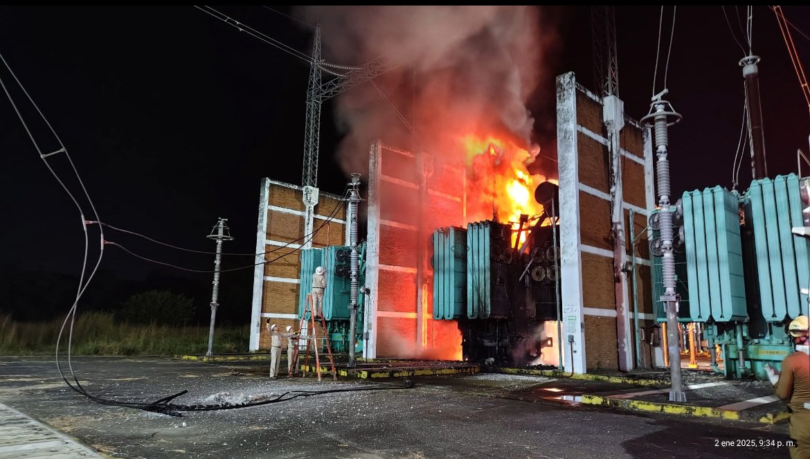 Tapachula, Chiapas (Balance México 02 de enero de 2025).- Un incendio en un transformador de potencia de la subestación de la Comisión Federal de Electricidad (CFE) en Río Florido ha dejado sin electricidad a varias colonias y ejidos de Tapachula, Huixtla y Suchiate así lo informó Demetrio Martínez, Secretario de Protección civil municipal.