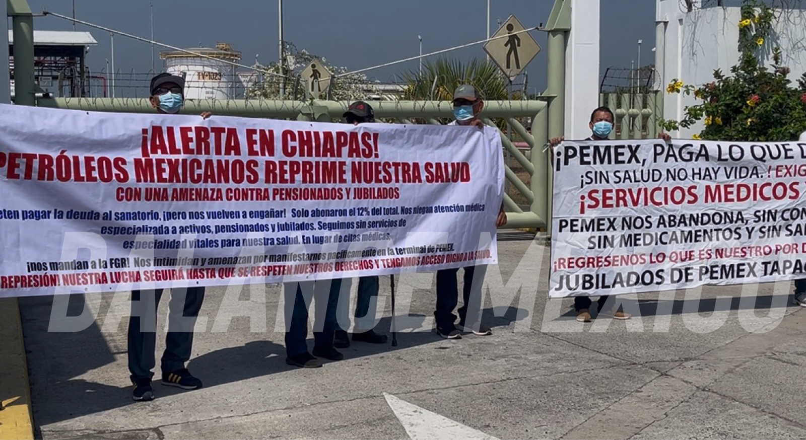 Tapachula, Chiapas (Balance México 23 Febrero 2026). — Jubilados y pensionados de Petróleos Mexicanos iniciaron este lunes una manifestación pacífica en la terminal de almacenamiento y reparto de Petróleos Mexicanos en Tapachula, ante la suspensión total de los servicios médicos que padecen desde hace varios meses.