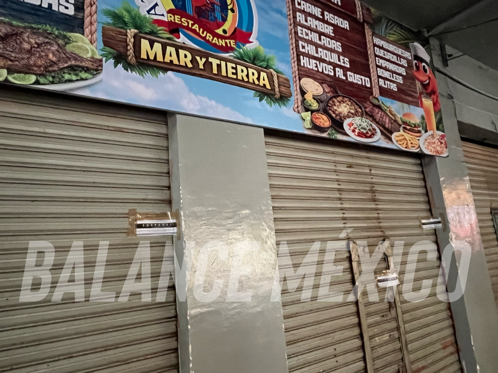 Tapachula, Chiapas (Balance México, 07 de abril de 2026).— El restaurante Atlantis Mar y Tierra, ubicado frente al parque central de Tapachula, permanece con sellos de suspensión colocados por autoridades sanitarias, como parte de un operativo realizado en la zona conocida como “Los Portales”.