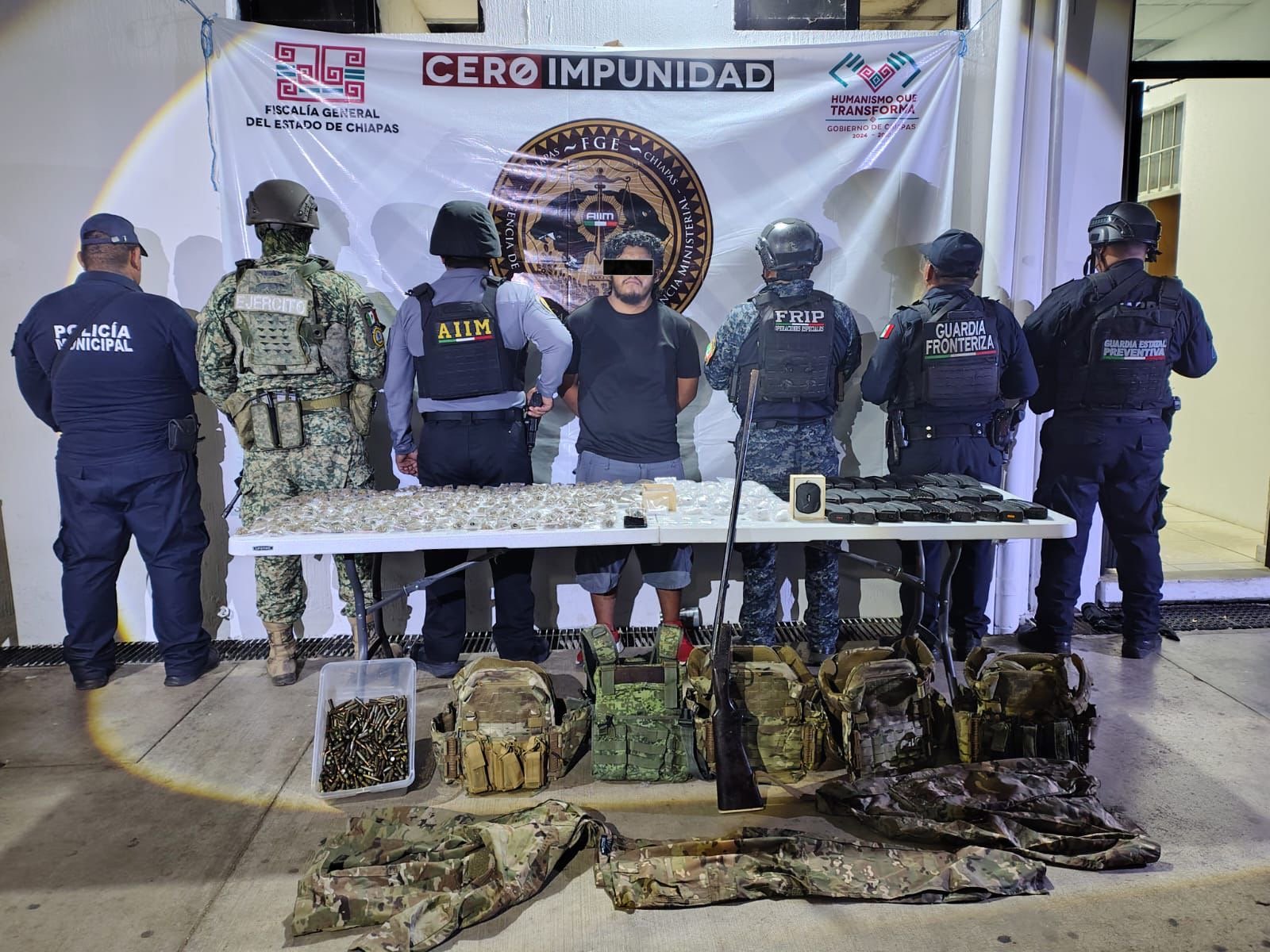 Tapachula, Chiapas (balance México 03 marzo del 2026.- Tapachula no da un paso atrás en la defensa de la tranquilidad de sus familias. Como parte de la respuesta del Operativo Huacali, este 3 de marzo, en la 3ª Oriente entre Privada 17 Norte, la Secretaría de Seguridad del Pueblo, a través de la Fuerza de Reacción Inmediata Pakal (FRIP) y en coordinación con la Agencia de Investigación e Inteligencia Ministerial, la Guardia Estatal Fronteriza, la Guardia Estatal Preventiva y la Policía Municipal, logró la detención en flagrancia de Jonathan “N”, de 28 años de edad, originario de Tapachula, por su presunta responsabilidad en la violación a la Ley Federal de Armas de Fuego y Explosivos y delitos contra la salud.