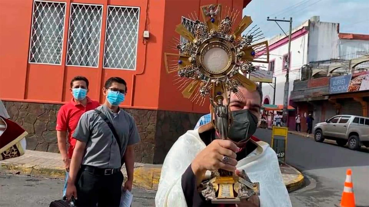 El obispo de Matagalpa, Monseñor Rolando Álvarez, salió este pasado jueves a la calle acompañado del Santísimo pese al cerco policial instalado en la zona donde se ubican los edificios de la Curia Episcopal y Cáritas en Matagalpa.