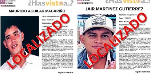 Se trata de Mauricio Aguilar Magariño, de 20 años de edad, y Jair Martínez Gutiérrez, de 22 años, ambos originarios de Arriaga, Chiapas, quienes habían sido vistos por última vez el pasado 18 de marzo de 2026 en el ejido Lázaro Cárdenas.