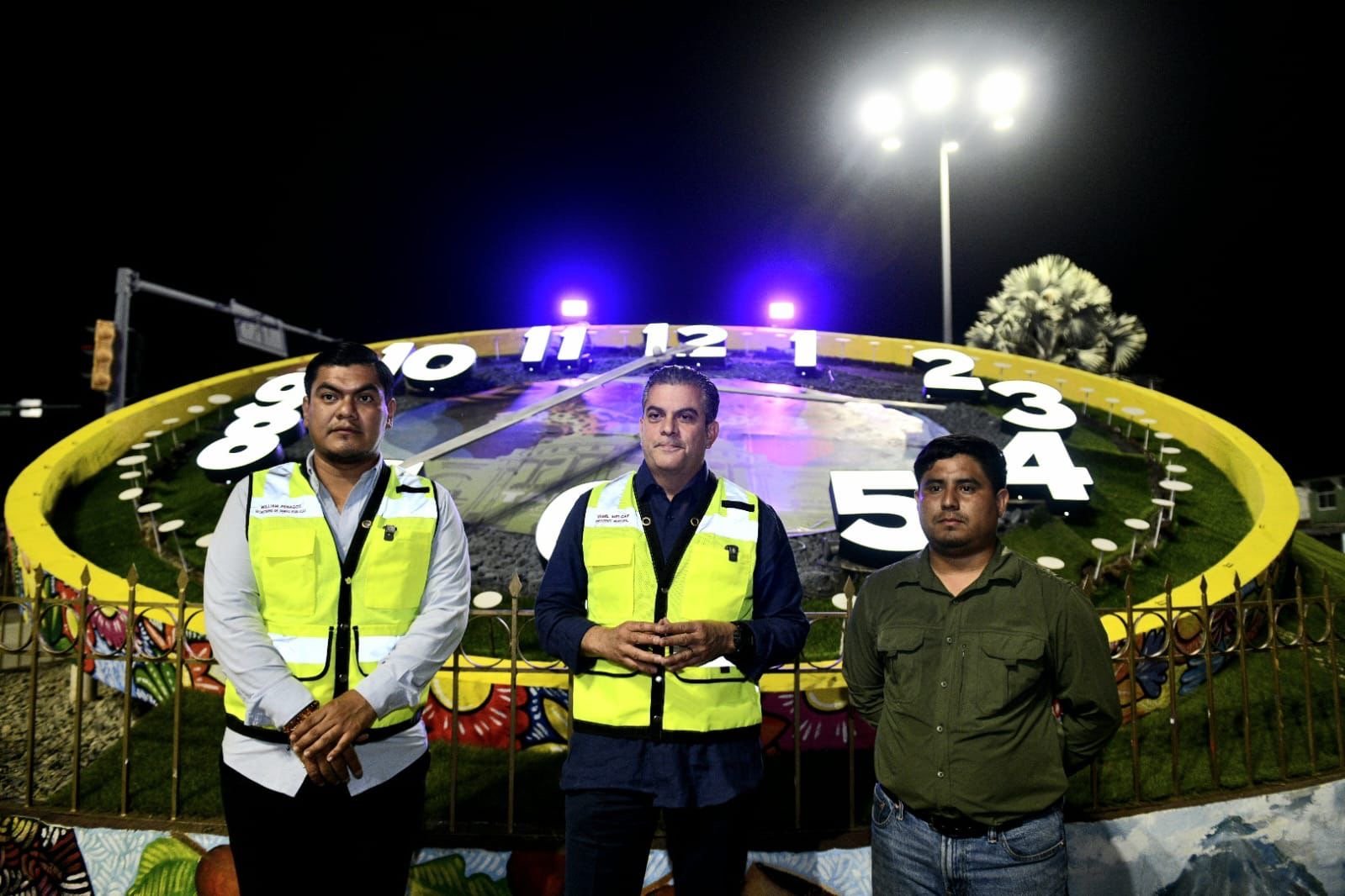 Como parte del mejoramiento integral del espacio, se implementaron acciones de iluminación estratégica, incluyendo reflectores de alta potencia instalados en torres elevadas, así como la iluminación de las letras distintivas y de los números del reloj floral, lo que permite reforzar la visibilidad y brindar mayor seguridad tanto para peatones como para automovilistas. Asimismo, se informó que las manecillas del reloj están próximas a entrar en operación para marcar correctamente la hora, una vez concluya la reparación del motor, el cual requiere piezas especiales para su funcionamiento.